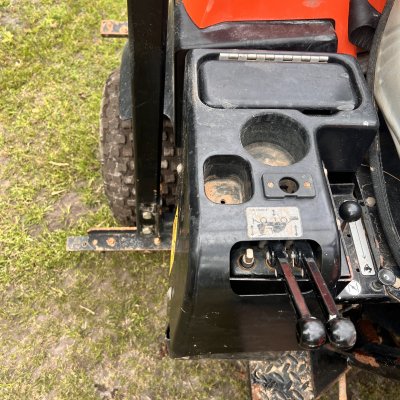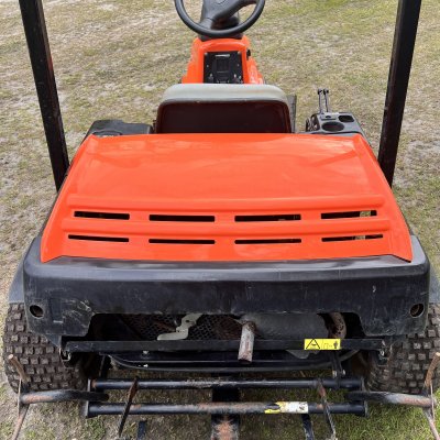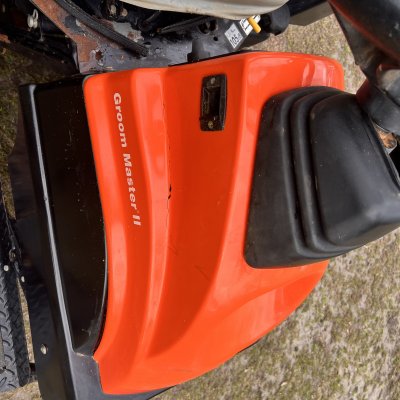 Runs and works good. Scarifier and rear rake. I also have a manual front blade available. There's a crack in front plastic(pictured) and typical wear for the age and hours. Used on a ball field, so it has red clay stains.