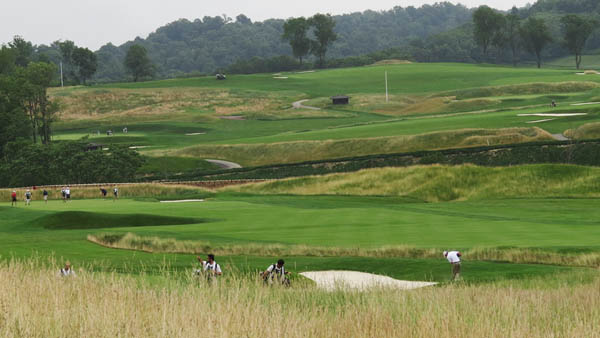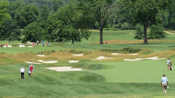 It's sometimes hard to distinguish between a really bad hole and one that just doesn't fit the golf course. This double-dogleg par 5 to a green fronted by a beach bunker (in Wisconsin!) makes a strong claim to both. Dye and the PGA's main setup man, Kerry Haigh, have done everything imaginable to reduce the likelihood of players coming into this wacky hole with short irons on their second shot. Most players would be wise just to hit a fairway metal or even a long iron off the tee and play it safe to set up a flip-wedge third shot. But players who can carry it 325 yards or more off the tee will be tempted to play boldly way right over sand and junk and risk ending up in an unplayable lie to a narrow shelf of fairway. The trouble is that if they hit it too far, through the narrow, 20-yard-wide neck of fairway, the ball goes into a man-made lagoon ? the same lagoon that snakes up ahead to the green. Sounds risky, except there's no risk if they end up long and wet off the tee because they get a drop (plus penalty stroke) and can still hit the green with their third from only 185 yards out. For amateur golfers, this is a fascinating hole with plenty of options. For Tour-quality players, it's a hole with a mouthful of useless teeth. No. 6, par 4, 355 yards