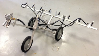 Eight spray nozzles are fed individually to ensure an even application across spray swath. The Spray Hound folds to 28" wide for storage and transport