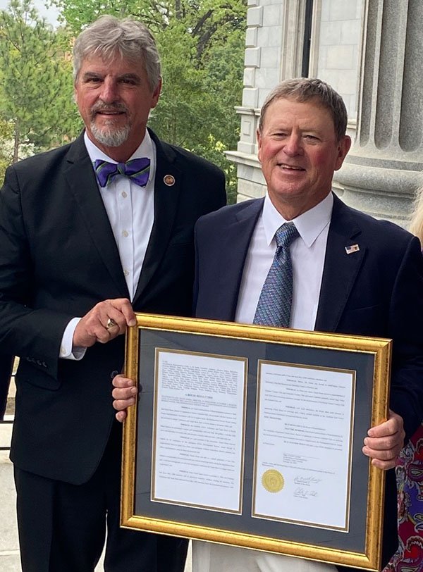 (Pictured at right: South Carolina Rep. Roger Kirby (left) presents Chuck Green with a resolution recognizing his contributions during a career as a golf course superintendent that has spanned more than 40 years.)