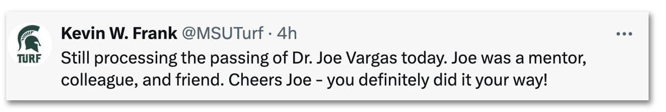 Vargas' career in turfgrass academia at Michigan State University spanned more than a half-century and was marked by defying convention and going against many accepted methods and practices. Along the way, Vargas ruffled a lot of feathers, particularly among those who dismissed his methods and findings. But for every colleague, golf course superintendent and chemical company representative who questioned his methods, there were many more who became believers, especially after his research and peer-reviewed publications began to mount up. Cornell University professor Frank Rossi, Ph.D., said if there was a Mount Rushmore of turfgrass management "Joe Vargas would be on it."